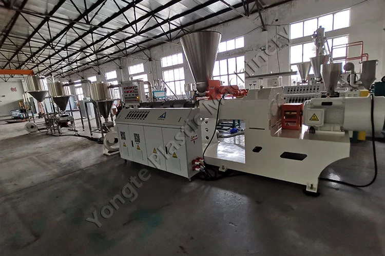 In 2024, rinneamar innealtóireacht ar mheaisín millíní cumaisc PVC saincheaptha do chliant Polainnis, atá deartha go sonrach chun gráinníní masterbatch PVC a tháirgeadh ó PVC athchúrsáilte agus filler CaCO₃. Is féidir an t-ábhar filler CaCO₃ a choigeartú go solúbtha idir 40% agus 80% chun ailíniú le sonraíochtaí táirgeachta an chustaiméara. I measc na bpríomhchodanna tá friothálacha uathoibríoch, easbhrúiteoir dhá-scriú cónúil SJSZ80/156 (mótar 75kW le inverter minicíochta ABB, ídíonn ~ 50KW le linn oibriú cobhsaí), dísle pelletizing te le haghaidh gearrtha gráinníní aonfhoirmeach, agus córas fuaraithe agus iompair aeir tapa trí chéim 304 cruach dhosmálta. Baineann an meaisín cumas táirgthe 300-400 kg / uair amach agus tógtar é le haghaidh oibriú leanúnach 24/7 le náid aga neamhfhónaimh. Bhí an tsuiteáil gan uaim, le tacaíocht ó fhoireann saineolaithe Yongte, a thug cúnamh ceann go ceann. I ndiaidh na suiteála, thug oiliúint ar an láthair an chumhacht d'fhoireann an chliaint an trealamh a oibriú go hinniúil, agus chinntigh tacaíocht theicniúil iargúlta trí fhísthreoir aon saincheisteanna a réiteach go pras, táirgeadh gan bhriseadh agus buaicfheidhmíocht a chothabháil.