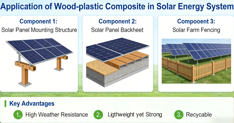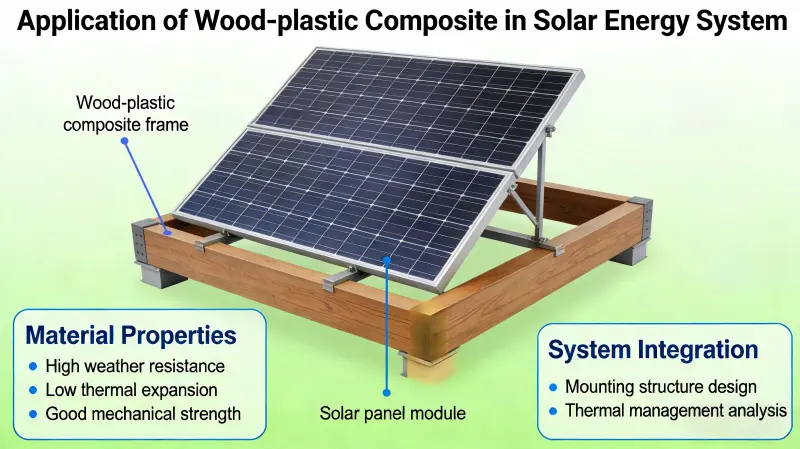 Tá cumaisc adhmaid-plaisteach tagtha chun cinn ó ábhair chúnta go croí-ábhair struchtúracha agus feidhmiúla i gcórais fuinnimh gréine, rud a léiríonn buntáistí suntasacha i gcórais gléasta fótavoltach, stáisiúin chumhachta ar snámh, agus Foirgnimh Chomhtháite Fótavoltach (BIPV). Le dul chun cinn amach anseo i leas iomlán a bhaint foirmlithe, nuálaíocht struchtúrach, agus laghdú costais, leathnófar a n-iarratas a thuilleadh, á suíomh mar cheann de na príomhábhair do chórais fuinnimh gréine glasa, ísealcharbóin agus fadtéarmacha.