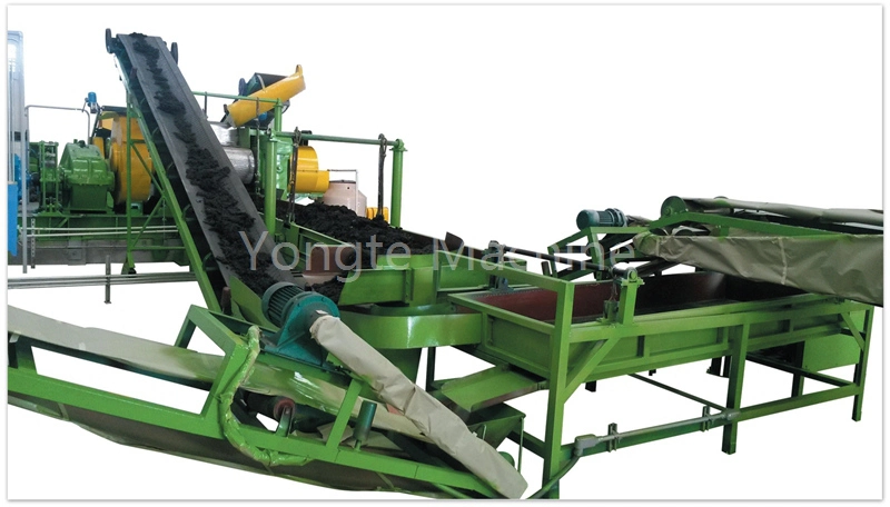 Úsáidtear an meaisín seo chun boinn rubair dramhaíola a thiontú go púdar rubair fíneáil. Áirítear leis an bpróiseas sreanga cruach a tharraingt amach, na boinn a ghearradh, a stialladh, a bhrú, an púdar a mheilt agus a scagadh. Ag baint úsáide as teicneolaíocht athchúrsála agus scaradh chun cinn, scarann ​​an meaisín sreang cruach, púdar rubair agus snáithín go héifeachtach ó na boinn rubair dramhaíola. is féidir leis an acmhainn táirgthe a bheith 500-600kg / uair an chloig. Is féidir an púdar rubair próiseáilte a úsáid chun píopa nana rubair a dhéanamh go díreach.